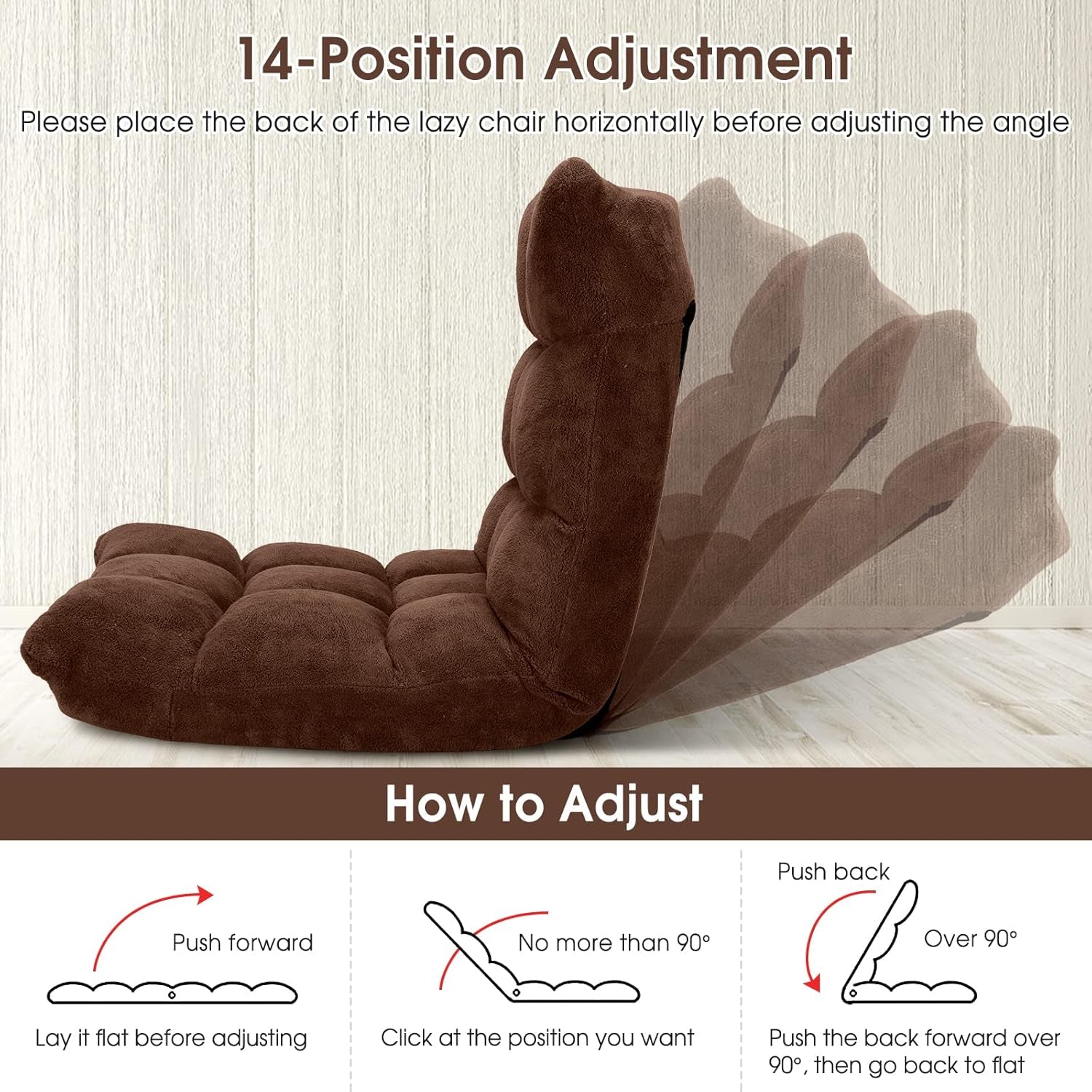 - 14-level Adjustments: This floor chair features a 14-position adjustable backrest that fulfills your different needs, such as napping, reading, gaming, working, watching TV and meditation. And the fully flat position is included for better relaxation.
